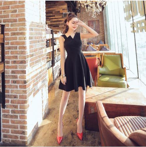 2017春新款欧美气质高腰显瘦不规则领吊带无袖大摆连衣裙