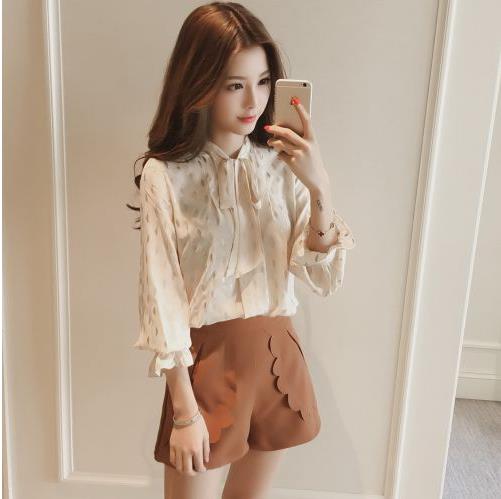 2017春夏新款韩版系带蝴蝶结印花雪纺衫衬衫女装长袖打底衫上衣
