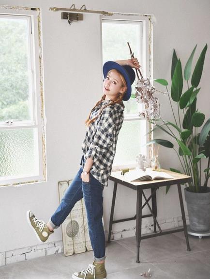 想用格子衬衫显示自由随意的心情,可以选择搭配浅色的牛仔裤子。稍卷的裤脚格子和衬衫的格子呼应,再配上一双经典懒人鞋是不错的选择。松松垮垮的慵懒是今年最时髦的感觉。