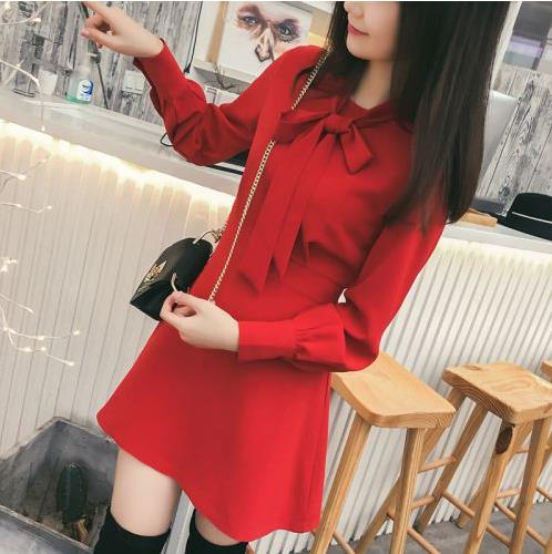 蝴蝶结票带领修饰脖颈,比起高领一点不挑人修身掐腰设计版型,上身非常显瘦,很藏肉的一款连衣裙,纯净的红色,简洁却又充满吸引力下摆自然散开,优雅气质尽显,修饰腰身,随着你的步伐随意摆动,青春活力范,搭配裤袜加上一件薄外套就可以了