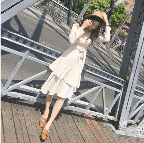 不规则荷叶边蛋糕裙系带收腰长袖V领连衣裙长裙