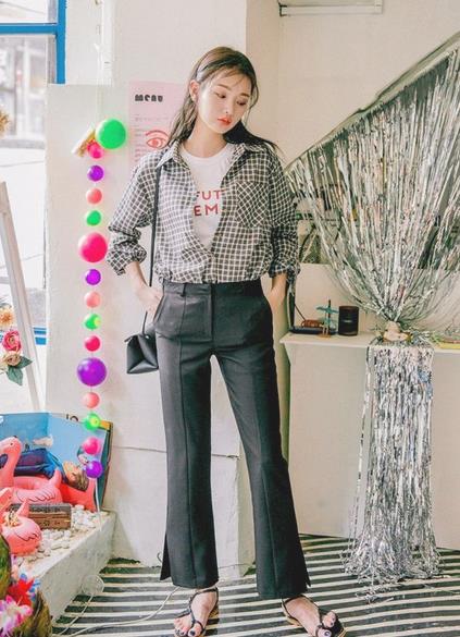 随着阔腿裤的慢慢退温,紧随而来的喇叭裤慢慢取代它的位置,如果说阔腿裤是掩饰腿型的缺点,那么喇叭裤就是用来修饰腿型的优点。搭配黑白格子衬衫,多了些许年轻的朝气,高腰穿法更是搭配迷人大长腿。