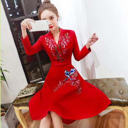 春季新款名媛气质长袖V领修身裙子复古红色梅花刺绣连衣裙A字裙潮