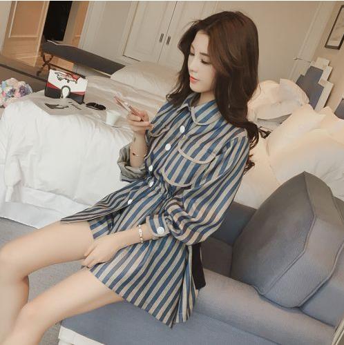 2017春装新款韩版时尚中长款条纹衬衫休闲套装女阔腿短裤两件套潮