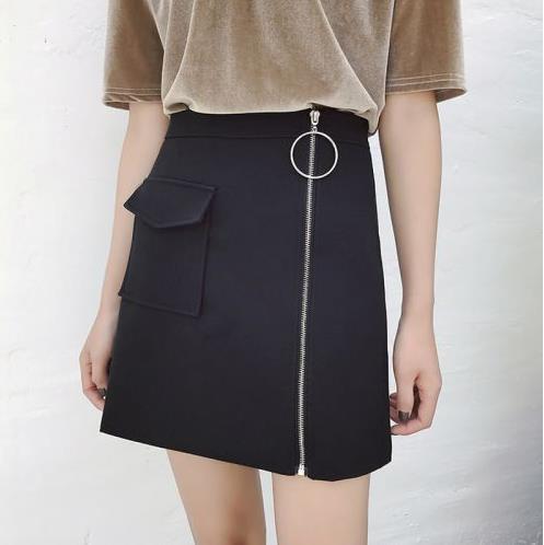 2017初春百搭高腰修身短裙纯色个性侧边金属圈拉链显瘦A字半身裙