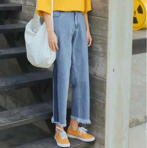 毛边直筒牛仔裤女高腰学生韩国复古文艺宽松bf风九分阔腿裤