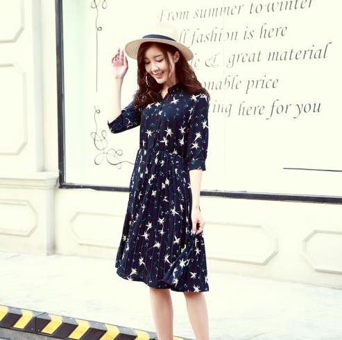 藏蓝色款式的连衣裙,因为色调深沉的关系,所以也很有显瘦的效果哦,修身款式比较适合那些身材胖,但是身型线条还算优雅的妹子,搭配细小的碎花做点缀,胖妞也能迷人的很。