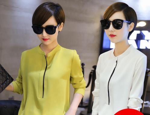 女装中长款长袖雪纺衬衫立领百搭休闲打底衫宽松衬衣