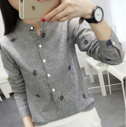 新款韩版条纹刺绣长袖衬衫女装修身显瘦打底衫上衣外穿内搭