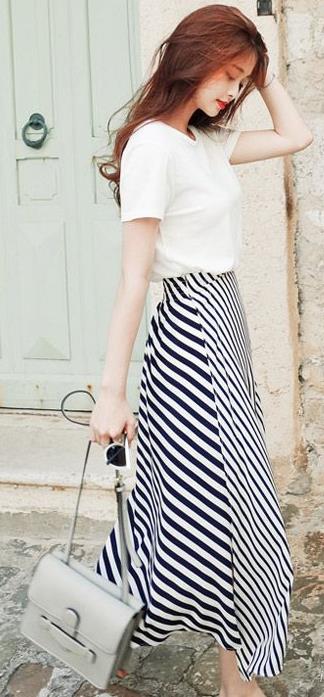 白T恤配黑白条纹长裙,简洁又时尚,优雅而文艺,这样的女神谁不动心呢?