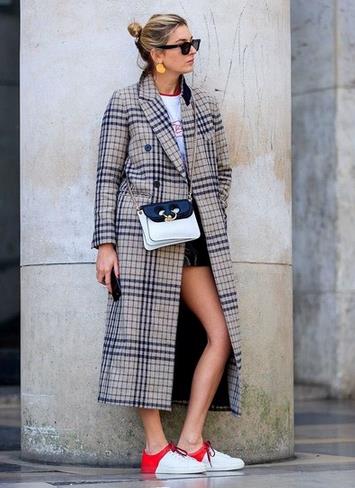 Camille Charrière,复古格纹要避免老气,不仅选品要睿智,在搭配上也要冲破藩篱,用图案T恤热裤运动鞋穿出活力新潮感,用色大胆,小面积金属色与亮色来点亮整个造型,也是活力减龄的有效方法。