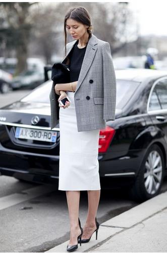 细小千鸟格西装外套搭出一身质感黑白灰,表达理智冷静的职场智慧。