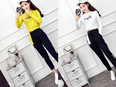金属扣的衣服系带下摆独特,黑色长裤有修身作用,充分显示了高腰苗条身材,也是显得青春甜美。