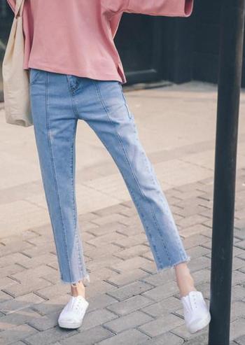 小腿弯曲的女生,在试穿裤子的时候,记得穿上你要搭配的鞋子。很多时候,穿上鞋子才能显示出小腿弯曲程度。小腿弯曲比较适合穿搭的裤子裤腿下垂后,脚后跟离地面5cm左右,直筒下摆的裤子最合适。九分裤或七分裤不要穿,会加重腿部弯曲的程度。