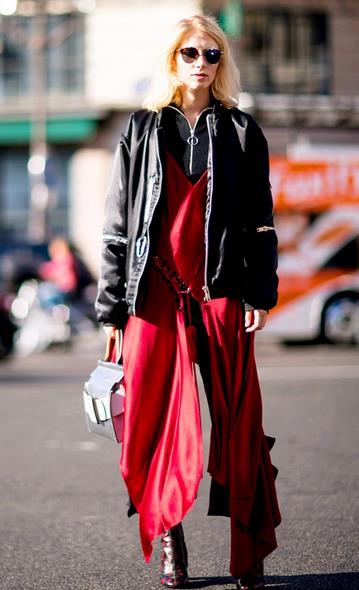 飘逸轻柔的吊带裙和帅气的羊羔绒夹克其实很般配。两种完全不同的材质配在一起,倒也别有味道。