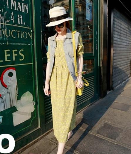 暖色调的雪纺连衣裙,为早春带来浓浓暖意,搭配一款牛仔马甲,帅气中又不失甜美,非常吸睛。