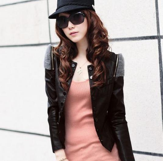 黑色双排扣PU外套小西装,里面搭配上长款的打底衫,下面配上牛仔裤,衣服设计很独特,把女孩子的帅气展现的淋漓尽致;