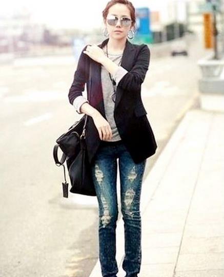 黑色小西装里面搭配上t恤,下面搭配上牛仔裤、高跟鞋,很适合逛街出行穿哦;