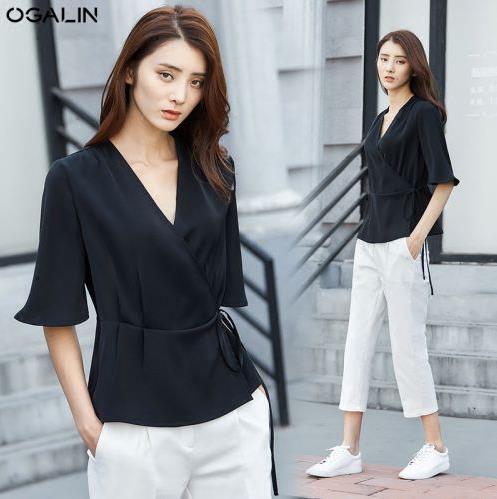 新款喇叭袖衬衫女V领收腰显瘦上衣中袖雪纺衫