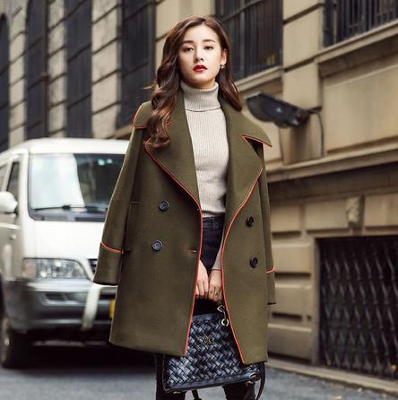 高端定制军绿色毛呢子外套女中长款新韩版宽松加棉大衣