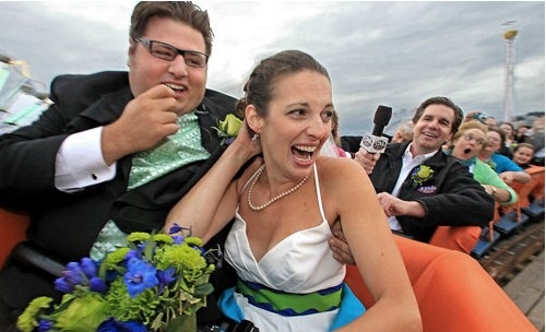 萨拉-佩蒂和罗伯特-斯切尔泽在说出“我愿意”之后,就登上了云霄飞车开始一段惊险的旅程。朋友们和家人会与他们一起登上云霄飞车享受这一过程,并且为新婚夫妇送上欢呼。