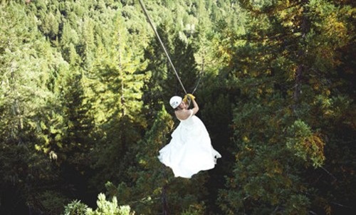对于新娘凯特和新郎亚伦来说,步入婚礼现场的方式更准确的说是快速飞下红地毯。在说出他们的誓约之后,这对夫妻捆绑在安全带上然后飞上了天空。