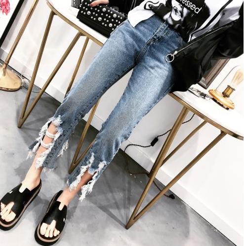 新款韩版磨破毛边直筒高腰破洞牛仔裤女显瘦浅色九分裤