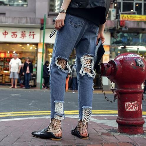 新款做旧毛边破洞牛仔裤女宽松九分裤显瘦乞丐裤送网袜