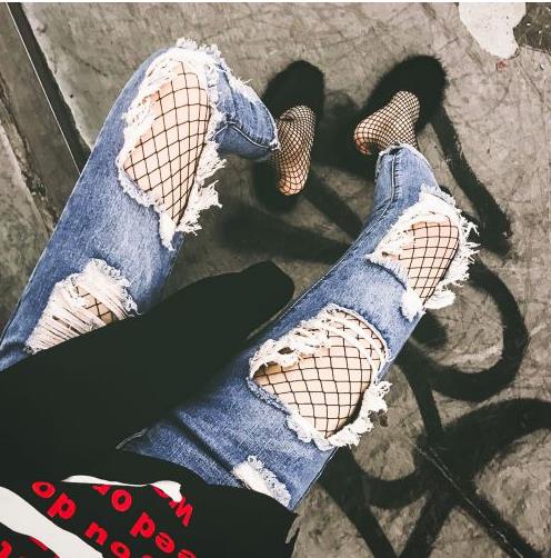 大破洞的牛仔裤,是每季都会有的,特别是春夏,我觉得大破洞配白T尤其好看!帅气又随性,现在这个季节搭配风衣外套,下身穿上这条破破的牛仔裤进行混搭,都很时髦~这条的显瘦效果也是超nice~对了 这款裤子也可以搭配最近超流行的网袜穿哦~看我搭配的效果是不是超性感超酷啊很推荐入!