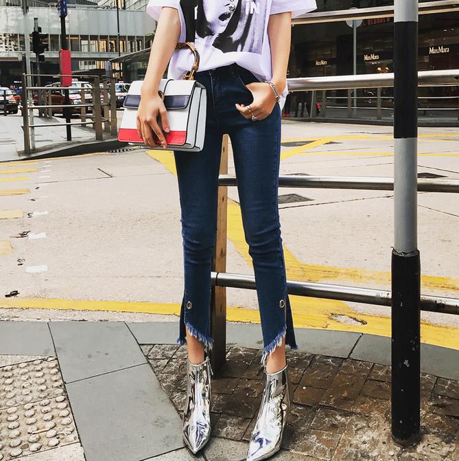 新款韩版潮脚口毛边开叉显瘦牛仔裤女九分裤