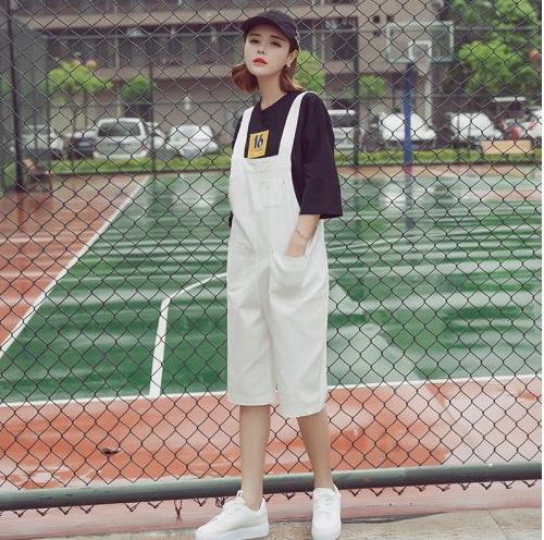 白色休闲背带裤女春季短裤宽松显瘦阔腿五分裤韩版百搭吊带裤学生