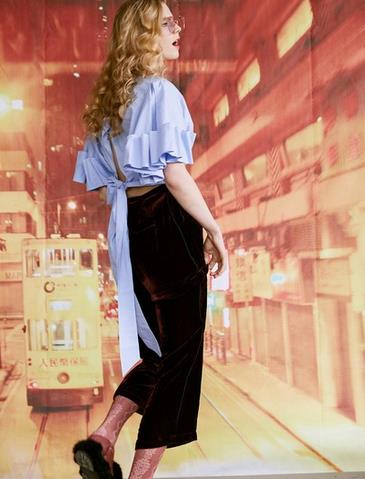 03 不要太艳丽是为了降低穿搭难度,也不要太规矩才能展现个性,细小的格子存在感极低被满满的设计感代替,采用了交叠V领、立体褶袖、背后镂空以及飘带收腰的crop-top款式,配合质感高腰裤装展现傲人小蛮腰,酷得迷人,酷出时髦新感觉。
