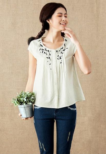 面料在某种程度上也影响着衣服的风格,亚麻是亲近自然派,体贴亲肤,贴身穿着很适合。亚麻衬衫走的是清新文艺风,小圆领,风琴褶,还有简约的绣花,将一个清秀可人的小女生刻画。