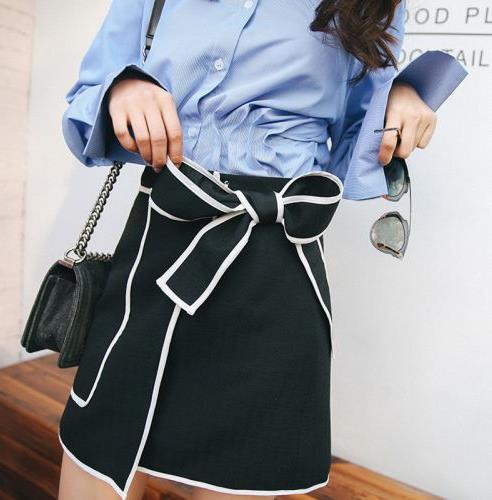 "气质担当 黑色蝴蝶结半身裙,裙子算是小A字裙,高腰设计,会显得腰细腿长,裙子里面利用一个小扣子固定整个裙子,通过腰间左右两侧的系带来控制腰部尺寸裙子一侧做了个大口袋的设计,整体利用白色包边,所以在视觉上非常好看,黑白经典搭配,保证你穿上身后,气质up up up 不知道几个level! "