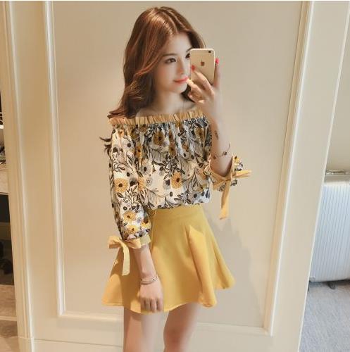 字领雪纺衫+高腰短裙的两件套~印花雪纺衫,长袖的款式,春夏季穿着都合适,一字领型,露出肩部和锁骨位置,增添几分小性感~袖口的绑带蝴蝶结设计,甜美俏皮感突显~搭配同色系的短裙,高腰设计,A字的版型,遮肉显瘦的恰到好处~将衣角塞进腰间,又是一个显高瘦的利器哟~
