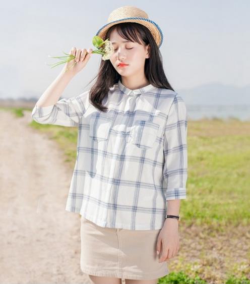 文艺内敛的格子是清新的复古元素,白底蓝格纹疏松清朗,乖巧的小翻领微修饰脸型添一抹别样魅力,宽松衣身放开束缚自由呼吸,呈现独具灵气的天然美,清澈眼眸淡雅气质,山水田园的自然情怀让人久久眷恋。