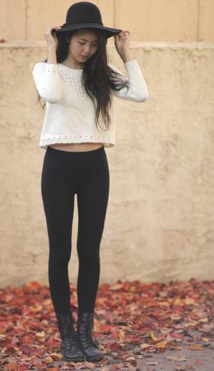 黑色阔边帽+白色针织衫+黑色休闲紧身裤+黑色高筒靴