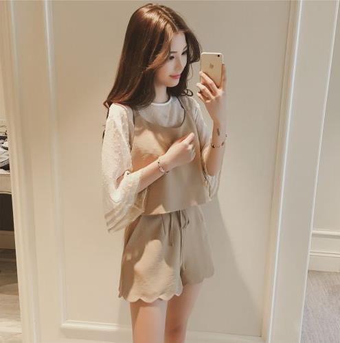 夏季新款韩版时尚雪纺衫上衣+吊带背心套装女短裤三件套潮