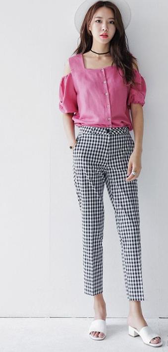 粉色露肩装粉嫩可人,女人味十足,非常时尚,配黑白小格子九分裤,扎着穿显高挑,看着清爽利落,干练不失甜美