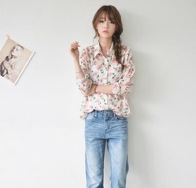 素雅碎花衬衫+boyfriend卷边牛仔裤